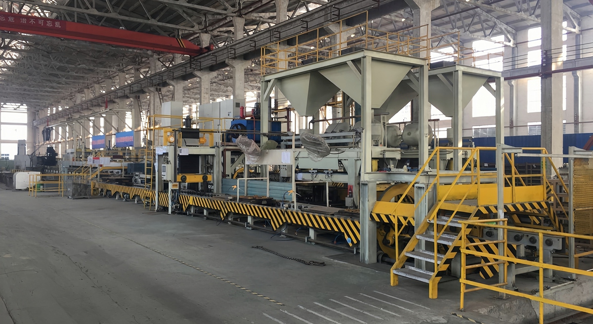 The biggest difference between iron mold sand molding line and wet sand molding line is that the mold is iron, and the top layer of sand is heated and cured to form. This kind of molding line used to have low efficiency and require a lot of labor. ABM Iron mould over sand moulding line is an automatic moulding line that consists of a moulding main machine, box turning machine, transfer car, motorized roller conveyor, box separator, box closing machine, casting section, core lowering section, and cooling section. Once the moulding process is finished, the iron mould is cleaned and repaired using the box-turning machine. It is then placed into the lower core section and closed by the box-closing machine before being pushed to the casting section. After cooling on the roller conveyor, the mould is cleaned by the box divider and the upper and lower boxes. Finally, it enters the main machine for moulding and completes the cycle. The new iron mould sand moulding line has improved the transmission, pushing and slowing, roller, and electric systems from the original line. This has resulted in a more stable system with a lower failure rate and higher efficiency compared to the original iron mould sand moulding line.